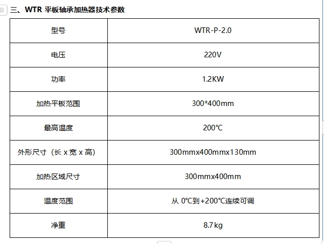 WTR-P-1.6平板轴承加热器用于安装前加热轴承和机械部件,适用于内径不大于100mm,重量不超过5Kg或多个小尺寸工件。加热器温度可达200度,加热器配有上盖,以便保持热量及防止灰尘进入轴承。